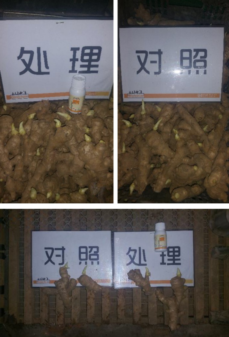 在晒姜时,使用乾力300倍液,对大姜两面进行喷施,晾干后催芽,可以显著地提高出芽率,增加新芽的强壮度。