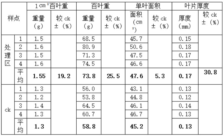 于阔实第二次喷施后一周,每处理调查4株树,每株树按东、南、西、北、中五个方位,每方位随机摘取有效叶片20个,在室内用精密天平调查百叶重,用1㎝2叶片打孔器调查叶面积,并测定叶片厚度。