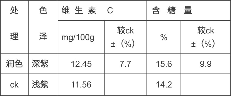 大樱桃采摘后,果实样本寄送烟台农科院检测果实品质(表5),润色处理区大樱桃果实为深紫色,对照区果实为浅紫色;处理区维生素C含量达到12.45 mg/100g,较对照高出7.7%;处理含糖量达到15.6%,较对照高出9.9%。